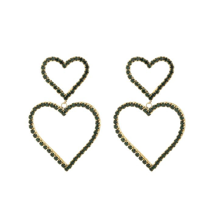 Hartjes oorbellen van stainless steel met groene steentjes.